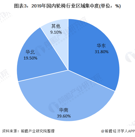 我國輪椅主要的生產(chǎn)基地集中在上海、廣東、江浙和天津等地區(qū),華南、華東地區(qū)占據(jù)主要市場。截止2019年,我國國內(nèi)輪椅行業(yè)區(qū)域集中度分別為華東31.8%,華南39.6%,華北19.5%,其他9.1%。