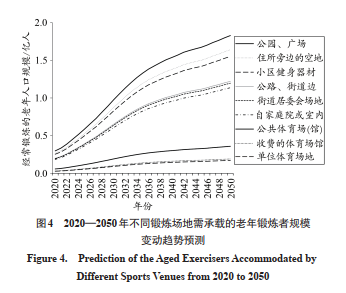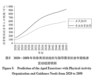 本研究基于體育強(qiáng)國(guó)建設(shè)與人口老齡化的現(xiàn)實(shí)背景,利用人口預(yù)測(cè)和增長(zhǎng)曲線擬合的方法對(duì)我國(guó)“十四五”期間和中長(zhǎng)期的老年體育鍛煉人口的規(guī)模和結(jié)構(gòu)變動(dòng)趨勢(shì)進(jìn)行了預(yù)測(cè)。第一,我國(guó)參加體育鍛煉的老年人口總體規(guī)模將持續(xù)增長(zhǎng),“十四五”末期將達(dá)到8 471萬人,到2035年達(dá)到1.9億人,2050年達(dá)到2.6億人。第二,未來經(jīng)常參加體育鍛煉的老年人口年齡結(jié)構(gòu)將進(jìn)一步老化,高齡老年人占老年體育鍛煉者的比重有所上升。第三,參與各類體育活動(dòng)項(xiàng)目的老年鍛煉者將快速增長(zhǎng),預(yù)計(jì)到2050年左右將有超過2億人規(guī)模的老年人經(jīng)常進(jìn)行步行鍛煉。第四,各類場(chǎng)地需要承載的老年鍛煉者規(guī)模持續(xù)擴(kuò)大,公園、廣場(chǎng)類需要承載的老年體育鍛煉者將在2050年達(dá)到1.8億人的規(guī)模。第五,老年人鍛煉時(shí)對(duì)正式組織和專業(yè)指導(dǎo)人員的需求將持續(xù)增加,到2050年約有600萬老年人需要通過正式組織的方式進(jìn)行鍛煉,約927萬老年人需要專業(yè)體育指導(dǎo)人員進(jìn)行指導(dǎo)。