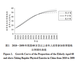 其中,t為時(shí)間,P為時(shí)間t時(shí)60歲及以上老年人經(jīng)常參加體育鍛煉的人數(shù)比例,e為自然對(duì)數(shù)的底數(shù),L為老年人總體鍛煉比例的最大極限值,a、b為相關(guān)參數(shù)。本研究根據(jù)(2)式預(yù)測(cè)老年人總體鍛煉比例的增長(zhǎng)曲線,將2018年CLASS結(jié)果(13.27%)作為預(yù)測(cè)曲線的第一個(gè)基準(zhǔn)點(diǎn)。參照《體育強(qiáng)國(guó)建設(shè)綱要》提出的2035年經(jīng)常參加體育鍛煉人數(shù)比例達(dá)到45%以上的戰(zhàn)略目標(biāo),將其作為預(yù)測(cè)曲線的第二個(gè)基準(zhǔn)點(diǎn)。參照已步入深度老齡化社會(huì)的日本老年人鍛煉水平對(duì)老年人總體鍛煉比例的極限值(L)進(jìn)行設(shè)定。根據(jù)日本厚生勞動(dòng)省發(fā)布的“國(guó)民健康營(yíng)養(yǎng)調(diào)查”②中老年人“有運(yùn)動(dòng)習(xí)慣者”③的比例,本研究設(shè)定了老年人總體鍛煉人數(shù)比例極限值為50%、55%、60%的低、中、高3個(gè)方案。據(jù)此,通過Logistic增長(zhǎng)曲線擬合出3種方案下2018—2050年老年人中經(jīng)常參加體育鍛煉的比例(圖1)。