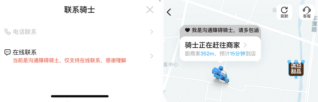 在獲得騎手授權(quán)后,餓了么App將向消費(fèi)者提示當(dāng)前配送騎手為聽障者。當(dāng)消費(fèi)者聯(lián)系騎手時(shí),“電話”選項(xiàng)會(huì)默認(rèn)關(guān)閉,系統(tǒng)將建議用戶消費(fèi)者與騎手在線文字溝通。“該服務(wù)的核心是尊重騎手的意愿和隱私,只要騎手不主動(dòng)設(shè)置,消費(fèi)者看到的訂單頁面仍和普通騎手完全一致。”餓了么聽障騎手體驗(yàn)負(fù)責(zé)人胡鹿強(qiáng)調(diào)。