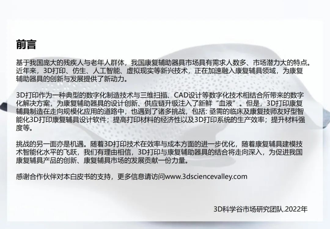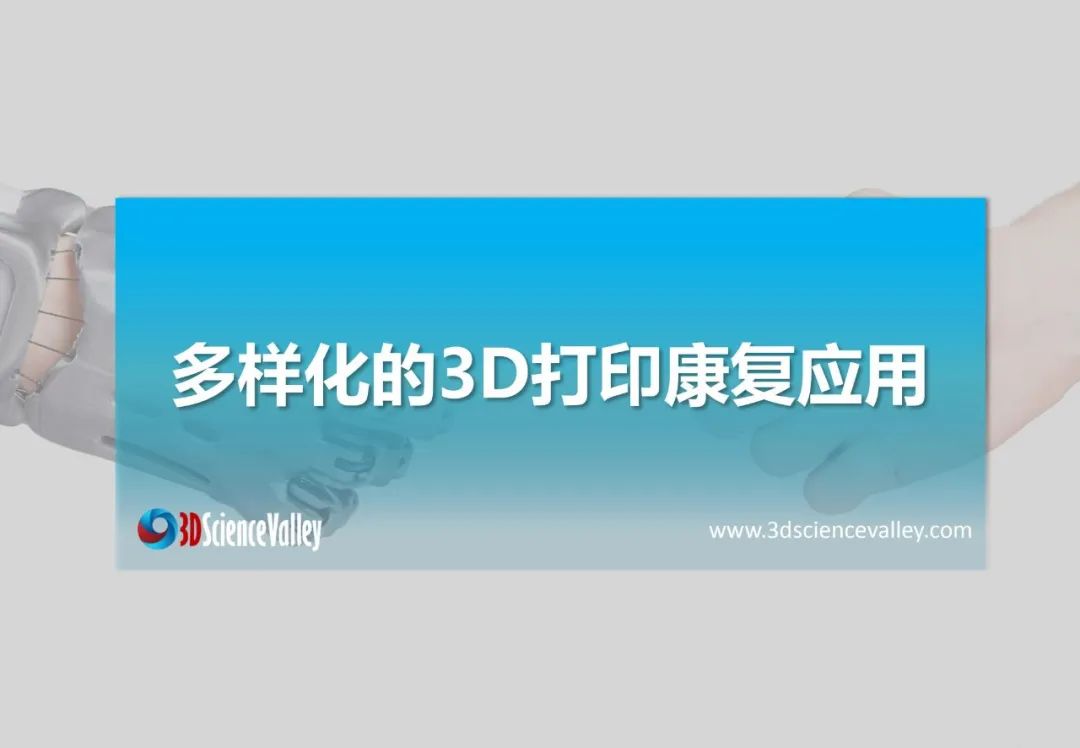 3D科學(xué)谷第三版《3D打印與康復(fù)輔助器具白皮書》,從康復(fù)醫(yī)療市場(chǎng)、多樣化的3D打印康復(fù)應(yīng)用、康復(fù)輔具設(shè)計(jì)及行業(yè)標(biāo)準(zhǔn)三大版塊,剖析康復(fù)輔具市場(chǎng)前景、挑戰(zhàn),3D打印技術(shù)與康復(fù)輔具制造的應(yīng)用結(jié)合點(diǎn),以及推動(dòng)3D打印康復(fù)輔具應(yīng)用走向深入的積極因素。