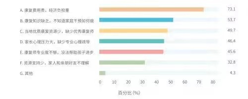 總體來(lái)看,康復(fù)費(fèi)用貴、康復(fù)資源少,服務(wù)質(zhì)量不夠高是家長(zhǎng)們普遍面臨的問(wèn)題?!端{(lán)皮書(shū)》顯示,73.1%的家長(zhǎng)認(rèn)為“康復(fù)費(fèi)用貴,經(jīng)濟(jì)負(fù)擔(dān)重”是主要困難。其次是“康復(fù)知識(shí)缺乏,不知道家庭干預(yù)如何開(kāi)展”,占比 53.7%,以及“當(dāng)?shù)貎?yōu)質(zhì)康復(fù)資源少,缺少優(yōu)秀康復(fù)師”占比 49.7%。