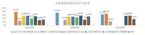 可喜的是,兒童康復(fù)行業(yè)已經(jīng)展現(xiàn)出多學(xué)科精準(zhǔn)康復(fù)的趨勢(shì)。從兒童康復(fù)師學(xué)習(xí)需求的角度來(lái)看,也呈現(xiàn)出多學(xué)科融合發(fā)展的趨勢(shì)。其中,在所調(diào)查的兒童康復(fù)師中,76.3%的ABA治療師希望學(xué)習(xí)言語(yǔ)語(yǔ)言治療技術(shù),占比近8成;72.1%的言語(yǔ)治療師希望學(xué)習(xí)ABA行為分析技術(shù),占比超過(guò)7成;同時(shí),分別有66.7%和62.3%的作業(yè)治療師希望學(xué)習(xí)言語(yǔ)語(yǔ)言治療和ABA行為分析技術(shù),超過(guò)6成。在兒童康復(fù)學(xué)科越發(fā)細(xì)分,越發(fā)專業(yè)的同時(shí),學(xué)科融合的趨勢(shì)也越加明顯。