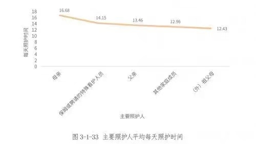 特殊家庭要付出的成本遠(yuǎn)不止金錢。數(shù)據(jù)顯示,當(dāng)母親作為主要照護(hù)人時(shí),平均每天照護(hù)16.68小時(shí),當(dāng)保姆作為主要照護(hù)人時(shí),平均每天照護(hù)14.15小時(shí),當(dāng)父親作為主要照護(hù)人時(shí),平均每天照護(hù)13.46小時(shí),而當(dāng)其他家庭成員和(外)祖父母作為主要照護(hù)人時(shí),平均每天照護(hù)時(shí)間分別為12.96小時(shí)和12.43小時(shí)??梢?jiàn),母親作為主要照護(hù)人時(shí),每天付出的時(shí)間是最長(zhǎng)的。