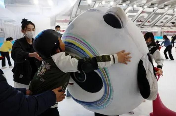 4月2日,北京,“星星的孩子”與冰墩墩人偶互動。當(dāng)天是第16個世界孤獨(dú)癥日。國家游泳中心(水立方/冰立方)第十三次為“星星的孩子”點(diǎn)亮藍(lán)燈。中新社記者 韓海丹/攝