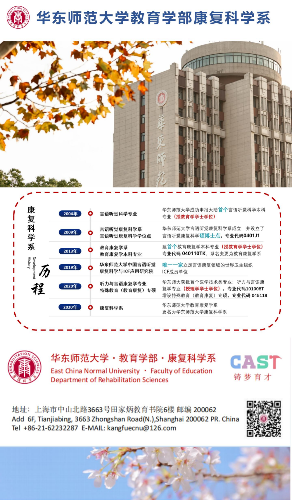 華東師范大學(xué)教育學(xué)部康復(fù)科學(xué)系始發(fā)于2004年我國大陸創(chuàng)建的首個(gè)言語聽覺科學(xué)專業(yè)。經(jīng)過近20年的建設(shè)努力,目前已發(fā)展成為本科、碩士和博士學(xué)位授予點(diǎn)齊全的專業(yè),包括教育康復(fù)學(xué)、聽力與言語康復(fù)學(xué)兩個(gè)本科專業(yè)、言語聽覺康復(fù)科學(xué)碩博士點(diǎn),以及特殊教育(教育康復(fù))專業(yè)碩士點(diǎn)。學(xué)生就業(yè)方向包括高校、特教學(xué)校、耳鼻喉科、口腔科,康復(fù)科、兒童保健科、康復(fù)機(jī)構(gòu)等不同領(lǐng)域。熱忱歡迎海內(nèi)外學(xué)子報(bào)考本專業(yè)!