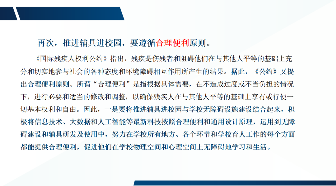 王紅霞校長作《“輔具進校園”工作的北京海淀經(jīng)驗》主題發(fā)言,對北京海淀相關工作經(jīng)驗予以了總結(jié)和可復制性分享。她指出,輔具要滿足不同障礙類型特殊學生的需求,要通過提供支持,改善功能;要通過促進參與,提質(zhì)增效;要尊重差異,體現(xiàn)價值;要增加互動,促進融合。她強調(diào),輔具進校園要遵循個別化的理念,提供適宜的資源支持。她展望,輔具能夠更加智慧化、系統(tǒng)化和多樣化,加強輔具資源的開發(fā)與利用,切實尊重學生的差異,支持所有學生最大限度融入集體,提升學習與生活質(zhì)量,讓所有學生同等有尊嚴地享受人生出彩的機會!