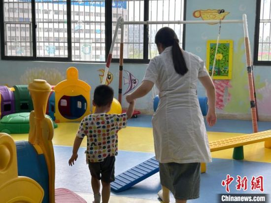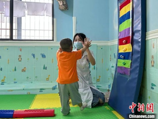 圖為康復(fù)教師帶著孩子進(jìn)行訓(xùn)練,在游戲中鍛煉孩子的聽(tīng)覺(jué)、視覺(jué)、運(yùn)動(dòng)能力等?!≈飕?攝