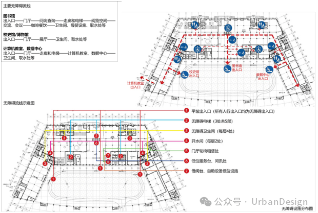 通過使用者視角的帶入,設(shè)計師在建筑內(nèi)部嘗試構(gòu)建連貫的無障礙流線(圖 9),連接各功能空間和無障礙設(shè)施,保證通行寬度和連續(xù)性,確保安全性和所有空間、設(shè)施可達易用。