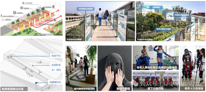 康復(fù)大學(xué)校園無障礙建設(shè)中,結(jié)合景觀環(huán)境,利用坡道柱廊下空間凈高 3.5~8.5m 區(qū)域及相鄰室外空間設(shè)置障礙體驗區(qū),提供臺階障礙體驗、視覺障礙體驗與老年人障礙體驗等,活化功能空間并突出康復(fù)教學(xué)特色,成為頗具特色的戶外教學(xué)場所(圖 19)。
