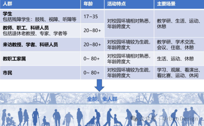 包容性校園的服務(wù)對象不再是少數(shù)殘障或運動損傷學(xué)生,而是擴展到全體在校師生及工作人員,以及來往于校園的專家學(xué)者、研究人員及普通市民,即面向全體社會成員,年齡覆蓋全齡(圖 1)。因此,校園環(huán)境在解決殘障群體需求的基礎(chǔ)上,在空間規(guī)劃和設(shè)施供給中,需要考慮校園內(nèi)各類人群學(xué)習(xí)、工作、生活需求及不同的體能特征和認知能力,提供多種可供選擇的通行、使用、交互和服務(wù)的方式。