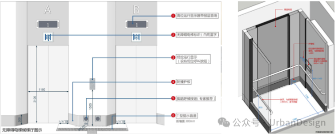 “創(chuàng)新核“建筑群內(nèi)部客梯共計 8 組 11 部 ,提高標(biāo)準全部設(shè)置為無障礙電梯(圖 12),方便所有人使用,避免區(qū)別對待。電梯口采用八字口,轉(zhuǎn)角進行圓角設(shè)計,避免磕碰危險。候梯廳設(shè)置低位呼梯按鈕、提示盲道、運行顯示裝置等,并增設(shè)腳踏按鈕。轎廂內(nèi)設(shè)置低位操作盤、盲文按鍵、三面扶手、鏡面材質(zhì)、報層音響、聲光顯示裝置等。