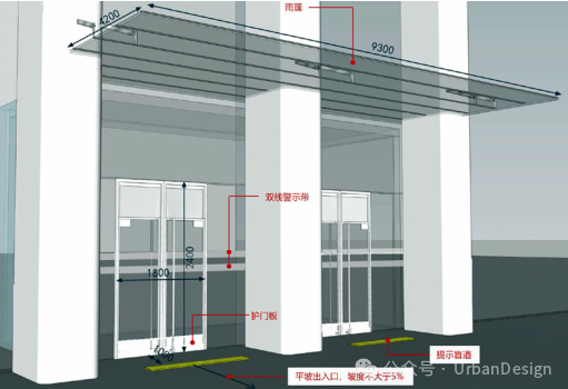 “創(chuàng)新核”主要出入口均為無障礙出入口(圖 11),并結(jié)合場地環(huán)境,采用坡度小于 5%的平坡出入口,形成便捷通暢的室內(nèi)外無障礙連通。出入口上方設(shè)置雨棚,外開門滿足單扇開啟時輪椅通行寬度要求,玻璃設(shè)置雙線提示帶,門斗滿足門扇開啟后的輪椅空間。