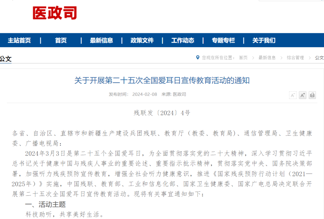 今年3月3日是第二十五個全國愛耳日,主題為“科技助聽,共享美好生活”。中國殘疾人聯(lián)合會、教育部、工業(yè)和信息化部、國家衛(wèi)生健康委員會、國家廣播電視總局日前聯(lián)合發(fā)布《關于開展第二十五次全國愛耳日宣傳教育活動的通知》,旨在加強聽力殘疾預防宣傳教育,增強全社會聽力健康意識,推進《國家殘疾預防行動計劃(2021—2025年)》實施。
