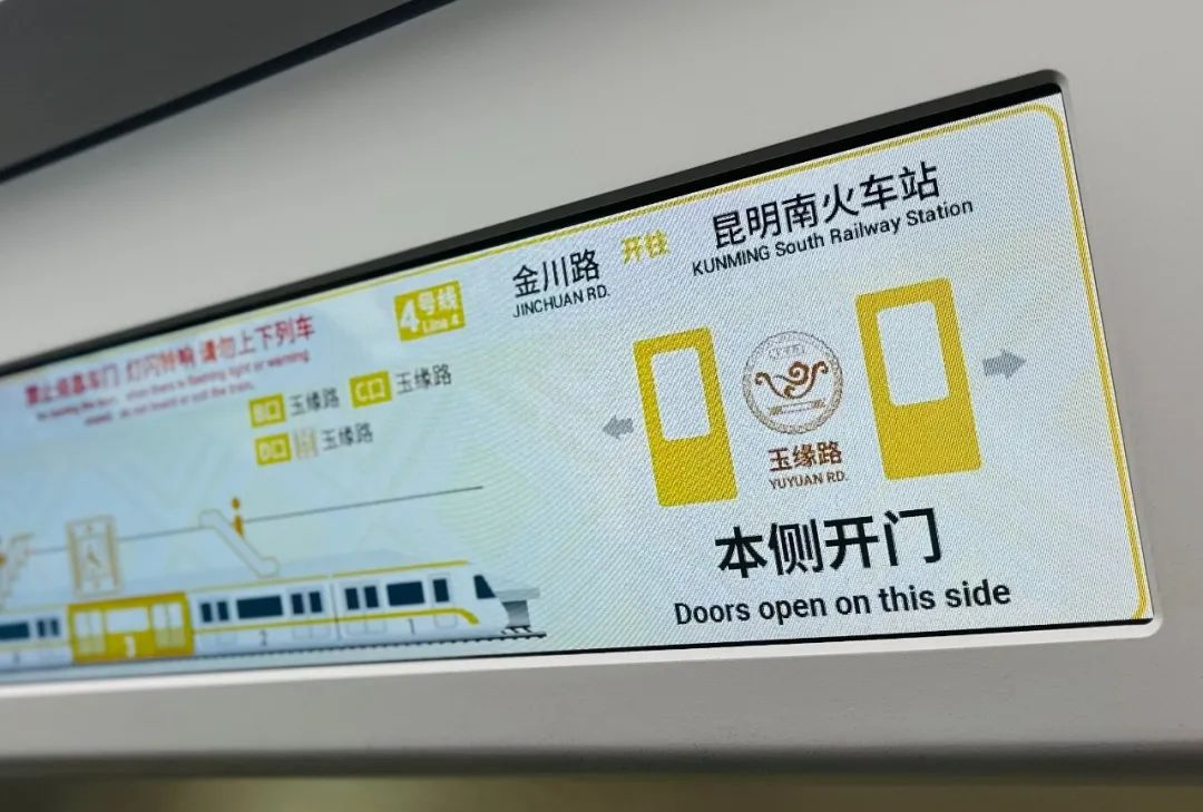 在車站內,昆明地鐵4號線公告欄新增公示公告適老化二維碼,乘客可通過掃描二維碼獲取具備大字、語音播報功能的公示公告;在列車上,新版列車動態(tài)地圖固定顯示乘車信息、新增關鍵信息顯示、增大字體內容;列車上可顯示新增服務熱線、各出入口周邊信息、設施信息等8個關鍵信息,以及車站衛(wèi)生間、站臺至站廳樓梯、扶梯、無障礙電梯等區(qū)域的位置;非開門側固定顯示線路圖,增大顯示對側開門信息,新增預計到站時間以及各換乘站換乘線路信息……