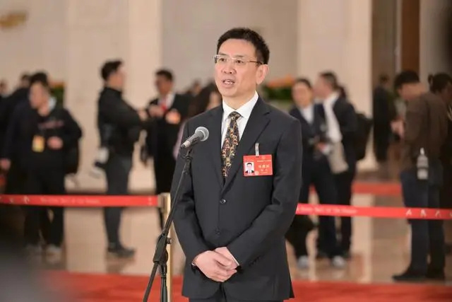 全國人大代表、武漢高德紅外股份有限公司董事長黃立在代表通道接受采訪。