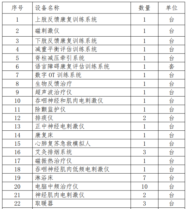 采購需求:三維干擾電治療儀、中低頻治療儀、磁振熱治療儀、沖擊波物理治療系統(tǒng)、空氣波壓力循環(huán)治療儀、超激光疼痛治療儀、電動(dòng)牽引床、訓(xùn)練用扶梯(雙向)、聯(lián)動(dòng)升降平行杠、肋木(帶肩梯)、升降單人站立架、抽屜式階梯、股四頭肌訓(xùn)練板、簡易運(yùn)動(dòng)訓(xùn)練套裝、踝關(guān)節(jié)矯正板、矯正鏡、醫(yī)師椅(不帶靠背)、診療臺(tái)、角度尺、楔形墊、手支撐器、分指板、滾筒、OT綜合訓(xùn)練臺(tái)、上下肢主被動(dòng)訓(xùn)練系統(tǒng)、床邊下肢主被動(dòng)訓(xùn)練系統(tǒng)、上肢康復(fù)機(jī)器人、腕關(guān)節(jié)智能康復(fù)機(jī)器人、踝關(guān)節(jié)智能康復(fù)機(jī)器人、小數(shù)字OT訓(xùn)練系統(tǒng)、數(shù)字OT評(píng)估與訓(xùn)練系統(tǒng)、外骨骼:步態(tài)與平衡功能訓(xùn)練評(píng)估系統(tǒng)、生物反饋刺激儀(吞咽成人版)、BOBATH床、三段多體位治療床、電動(dòng)起立床、脈沖針灸治療儀、特定電磁波治療器(TDP)、手搖式病床、床頭柜、多參數(shù)監(jiān)護(hù)儀、微量注射泵,詳見招標(biāo)文件第二章采購需求。