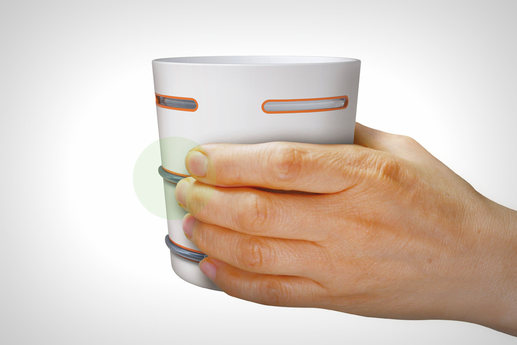 受酒吧杯具清潔器啟發(fā),這款無障礙飲水機(jī)讓用戶從杯子下部注水,使用者只需將特殊設(shè)計(jì)的杯子放在指定位置即可。按壓一次為冷水,兩次為熱水。飲水機(jī)的設(shè)定為每次只傾倒杯子容量80%的水,不用擔(dān)心溢出。