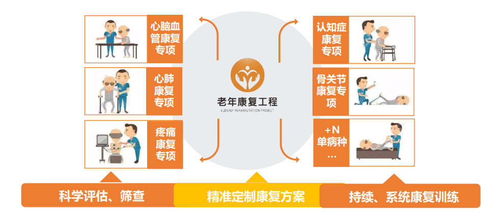 老年康復(fù)工程的主要康復(fù)專項,是依托優(yōu)質(zhì)康復(fù)資源,以模塊化的單病種康復(fù)服務(wù)體系,賦能給養(yǎng)老服務(wù)機構(gòu)——給規(guī)劃、給運營體系、給培訓(xùn)輔導(dǎo)、給增值產(chǎn)品。
