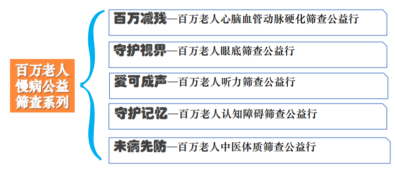 老年康復(fù)工程已推出了多個“百萬老人慢病公益篩查”系列活動,項目主要圍繞老年人常見慢病,用優(yōu)質(zhì)資源和品牌項目,開展公益活動;通過公益活動,進行市場推廣和培育,轉(zhuǎn)化自費用戶;發(fā)揮基金會的公募優(yōu)勢,以公益活動帶動社會資金籌措,反哺于自身業(yè)務(wù)。