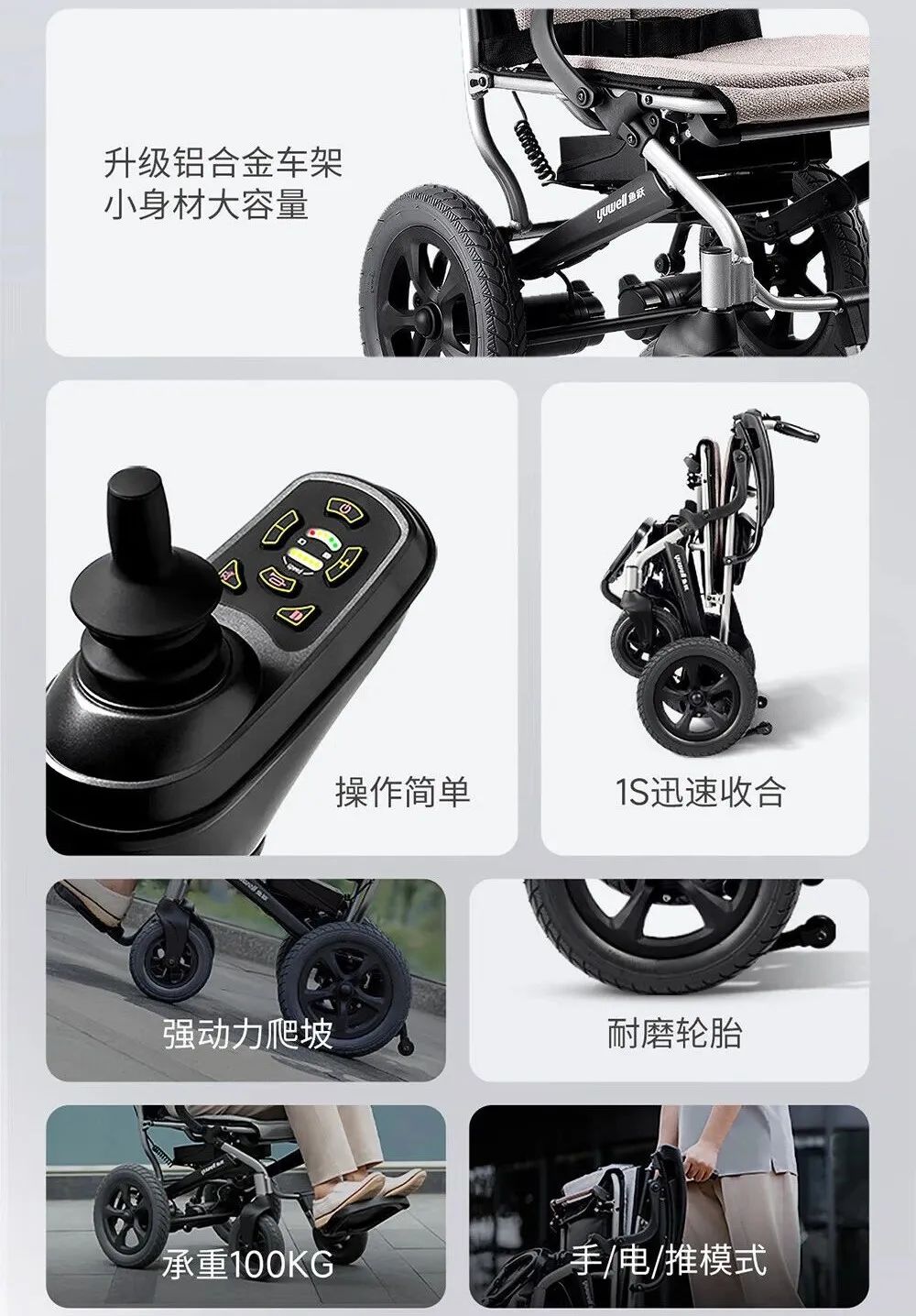 輕便短距離出游,可使用自帶電池一塊(1.4kg),續(xù)航12km。遠行出游,可在電池倉多放一塊電池,續(xù)航24km。輕便的電池僅重1.4kg,可放置在雜物袋內(nèi)備用。扶手一鍵快掀,幫助轉(zhuǎn)移位,控制器可根據(jù)使用習慣,更換左右手位置,運輸安全帶便于折疊運輸。