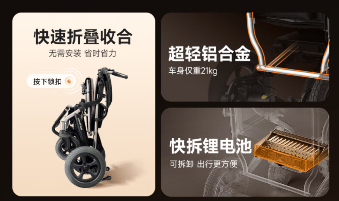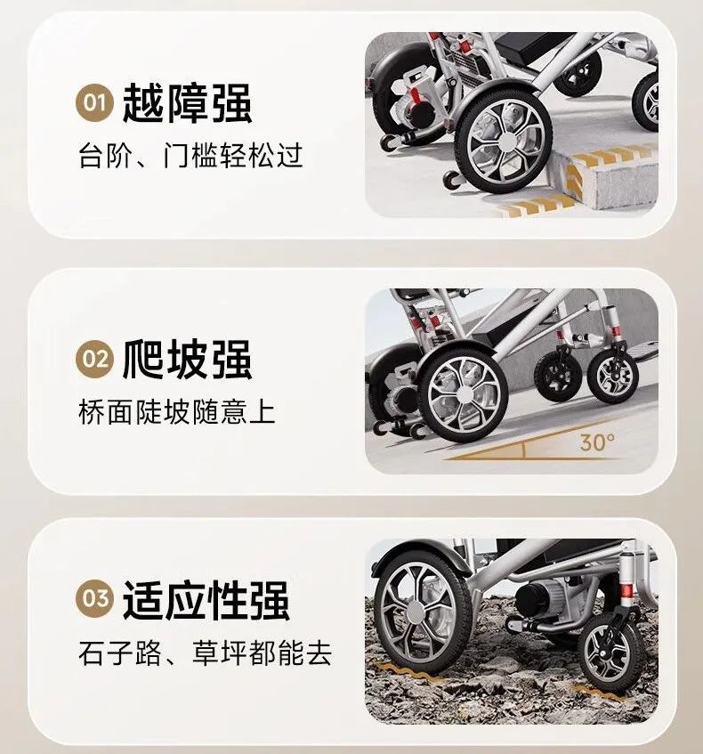 它輕便折疊的設計使得攜帶和存放都非常方便,無論是出門旅行還是日常使用,都能輕松應對。其次,全自動鋰電池驅(qū)動系統(tǒng)讓操作變得簡單快捷,老人只需輕輕按動按鈕,即可輕松控制輪椅的行駛方向和速度。此外,無刷電機的應用使得輪椅運行更加平穩(wěn),減少了噪音和震動,為老人提供更加舒適的乘坐體驗。