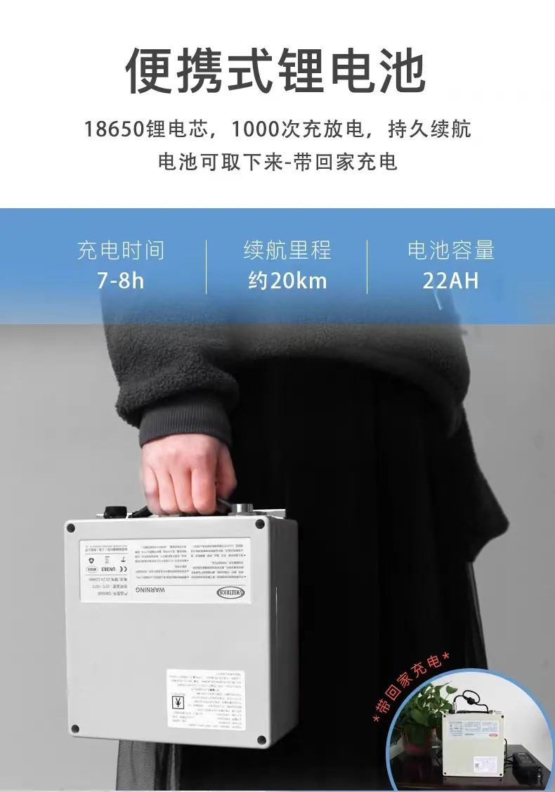 坐墊靠背采用抗菌、阻燃、防霉面料,通風透氣。整車采用電磁自動剎車系統(tǒng),安全可靠,放心行駛。便攜式24V12Ah鋰電池,容量大跑得遠,輕松拆取。只需在手機APP或者小程序上一鍵操作,就能自動開合折疊,方便快捷,智能安全。