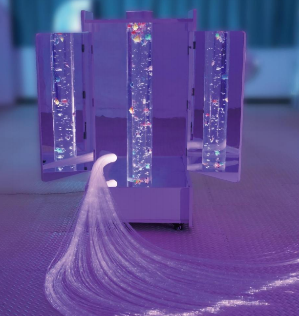 這款感官統(tǒng)合產(chǎn)品是專為兒童設計的,尤其適用于自閉癥和失語癥患者,外觀是一個可移動雙開門的柜子,產(chǎn)品內(nèi)部左右和底部設有鏡子,還有一根透明的亞克力柱,可產(chǎn)生多種七彩變光效果,并產(chǎn)生大量細小而均勻的氣泡,這些氣泡通過氣泡水柱上升,帶來微小的觸覺刺激,幫助放松身心,有一堆的光纖由柜子里面延伸而出,能隨著氣泡柱的變化而變化七彩顏色。坐在光纖氣泡柜旁邊,專注于觀察和感受水柱的運動氣泡的觸感和七彩變光的美感,對于自閉癥和失語癥患者,這個過程可以激發(fā)他們的感官注意力、幫助他們表達情感,并促進社交互動。