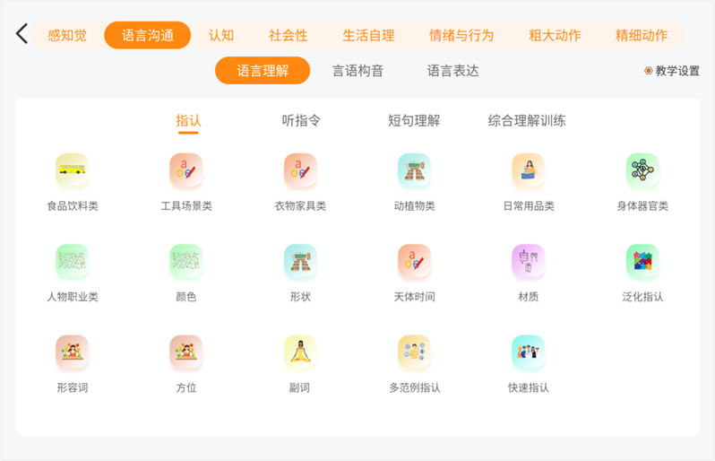 自閉癥評估與訓練儀集多種國內(nèi)外權威專業(yè)的評估工具,并配套相應的評估手冊和操作道具,同時和后續(xù)的訓練及個別教育計劃內(nèi)容啟動關聯(lián),可根據(jù)評估結果開展針對性訓練。該系統(tǒng)包括社會交往、認知訓練、語言溝通、感知覺、職業(yè)能力等八大維度的訓練內(nèi)容,涵蓋了數(shù)十個完全不同的個性化訓練目標。