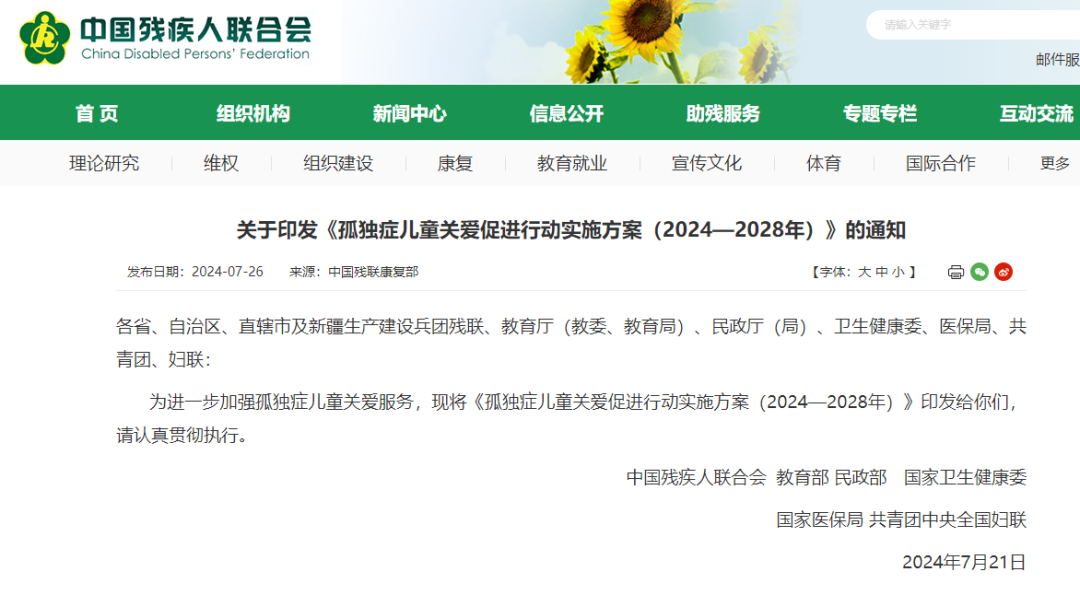 中國殘聯(lián),印發(fā)《孤獨癥兒童關(guān)愛促進(jìn)行動實施方案(2024-2028年)》https://www.cdpf.org.cn/zwgk/zcwj/wjfb/e9e23982df5248e3b0d82d180c368996.htm