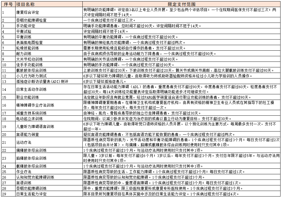 另外19個醫(yī)療康復(fù)項目放到了康復(fù)科,其中,運動療法、作業(yè)療法和平衡訓(xùn)練的支付期限都提高到了180天。