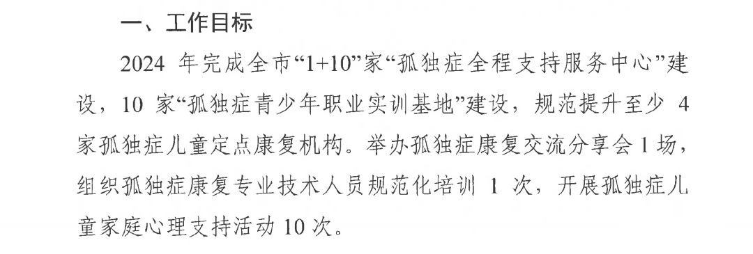 “持續(xù)提升孤獨癥早期篩查、診斷、康復(fù)水平,推進(jìn)孤獨癥兒童融合教育,促進(jìn)成年孤獨癥就業(yè),加強重癥孤獨癥托養(yǎng),做好孤獨癥民生兜底保障和無障礙環(huán)境建設(shè),建立完善我市孤獨癥全程支持服務(wù)體系。”