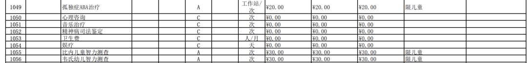除了在康復(fù)項目中有孤獨癥兒童語言障礙訓(xùn)練和ADI量表測評外,在精神科的診療項目中,還將ABA治療納入了A類項目。