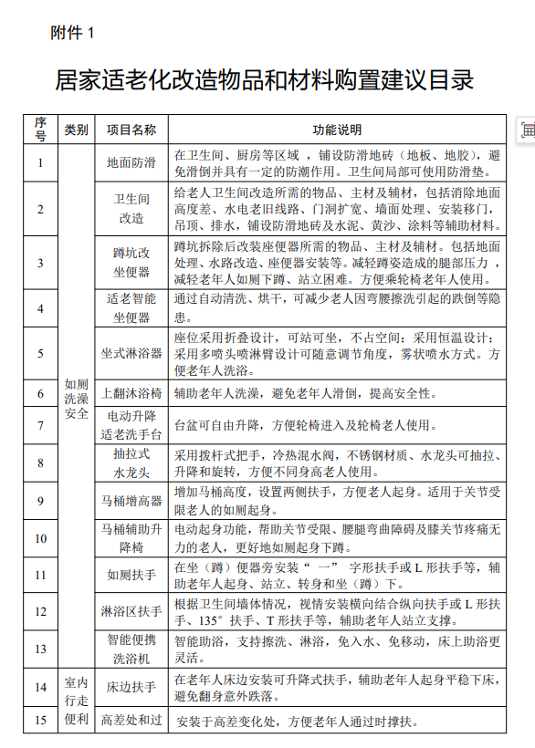 對(duì)購置《居家適老化改造物品和材料購置建議目錄》內(nèi)的物品和材料給予補(bǔ)貼。
