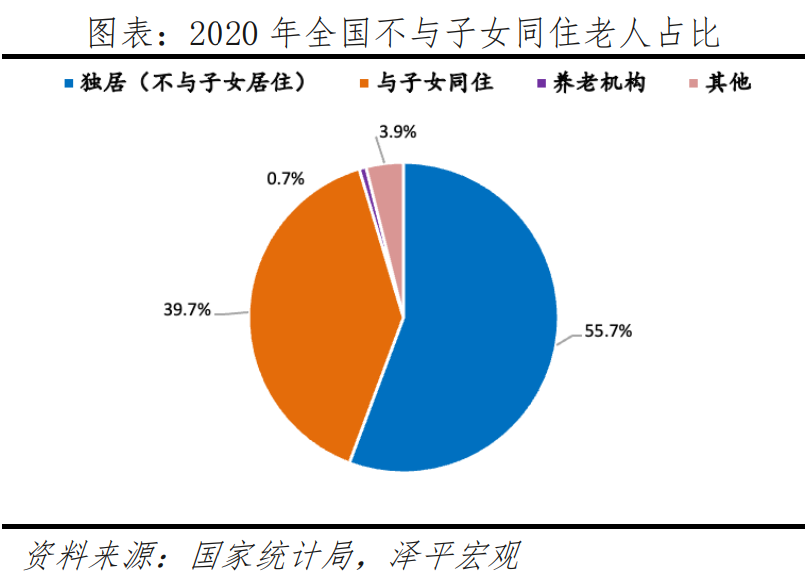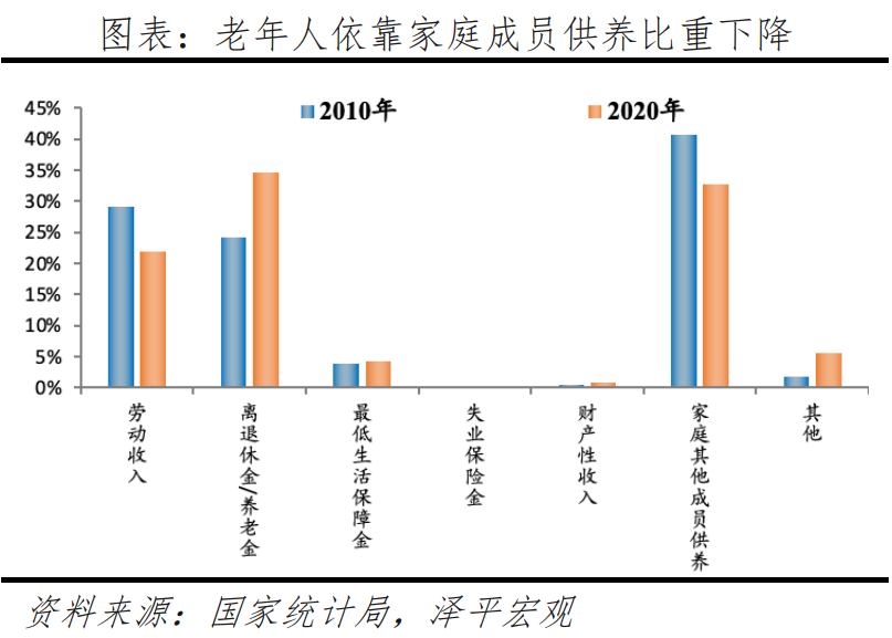 3)居住獨(dú)立、經(jīng)濟(jì)獨(dú)立,空巢老人占比超5成,2010-2020年依靠家庭供養(yǎng)比例從40.7%降至32.7%。隨著傳統(tǒng)觀念轉(zhuǎn)變,疊加家庭規(guī)模不斷縮小、子女?dāng)?shù)量下降、人口流動加快,老年人更多選擇不與成年子女同住。根據(jù)七普數(shù)據(jù),全國有39.7%的老年人與子女同住,55.7%的老年人只與配偶同住或者獨(dú)居。分城鄉(xiāng)看,城市、鎮(zhèn)、鄉(xiāng)村獨(dú)居老人占比分別為52.2%、53%、59.4%,由于農(nóng)村大量年輕勞動力外出務(wù)工或定居更發(fā)達(dá)地區(qū),更多老年人獨(dú)居在家。此外,隨著社會保障體系逐漸完善,更多老年人依靠離退休金生活,經(jīng)濟(jì)條件更加獨(dú)立。根據(jù)人口普查數(shù)據(jù),2010-2020年,60歲及以上人口中,依靠離退休金/養(yǎng)老金的占比從24.1%增至34.7%,依靠家庭其他成員供養(yǎng)的占比從40.7%降至32.7%。