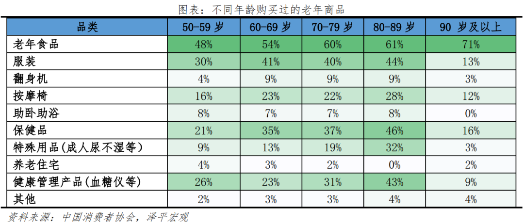 2)分年齡看,低齡老人需要消費(fèi)、社交、娛樂,高齡老人需要照護(hù)服務(wù),長壽老人關(guān)注身體機(jī)能變化等方面。傳統(tǒng)老年人口劃分為60歲及以上或65歲及以上人口,如果考慮備老人群,可把銀發(fā)群體擴(kuò)展到50歲及以上人群。按年齡劃分,銀發(fā)群體可分為準(zhǔn)老人(50-64歲)、低齡老人(65-74歲)、高齡老人(75-89歲)、長壽老人(90歲及以上)。年齡階段不同,老年群體的需求也不盡相同,其中準(zhǔn)老人處于職業(yè)生涯晚期,身體相對健康,即將退休,重點(diǎn)關(guān)注文娛、抗衰老等方面;低齡老人剛步入退休階段,處于退休適應(yīng)期,重點(diǎn)關(guān)注健康管理、娛樂社交等方面,對短途旅行、老年大學(xué)等方面的需求增加;高齡老人身體機(jī)能減退,自理能力減弱,更加關(guān)注醫(yī)療保健、養(yǎng)老服務(wù)等方面;長壽老人更加注重精神層面需求,安享晚年生活。