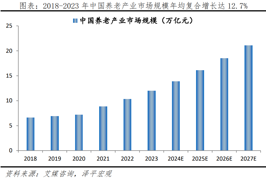 隨著人口老齡化時(shí)代到來,為滿足中老年人群體在衣、食、住、行、醫(yī)等方面需求,銀發(fā)經(jīng)濟(jì)市場潛力巨大,預(yù)計(jì)到2050年,老年人口消費(fèi)總量將占中國GDP的21%。新一代中老年人群教育水平普遍較高,他們在退休后更重視生活質(zhì)量和社交活動,愿意為自己興趣和愛好買單,這為銀發(fā)經(jīng)濟(jì)市場蓬勃發(fā)展提供堅(jiān)實(shí)基礎(chǔ)。據(jù)艾媒咨詢、中國老齡科學(xué)研究中心數(shù)據(jù),2018-2023年,中國養(yǎng)老產(chǎn)業(yè)市場規(guī)模年均復(fù)合增長率達(dá)12.7%,預(yù)計(jì)2050年老年人口消費(fèi)總量為40萬-69萬億元,占全國GDP的20.7%。