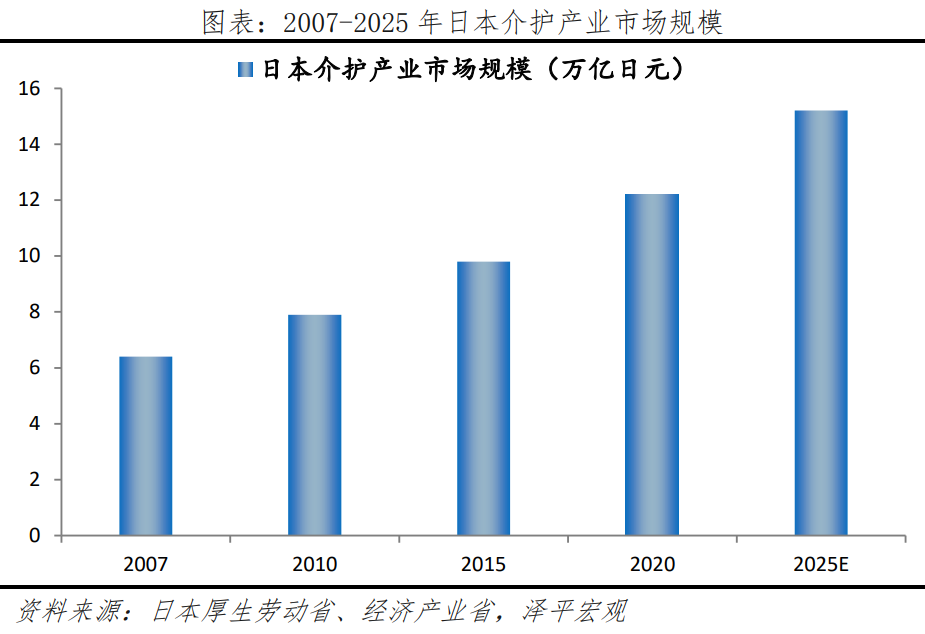 1)護(hù)理產(chǎn)業(yè)方面,日本介護(hù)市場規(guī)模持續(xù)快速增長,在《介護(hù)保險(xiǎn)》支持下,老年人介護(hù)產(chǎn)業(yè)呈現(xiàn)出高度標(biāo)準(zhǔn)化、多樣化和個(gè)性化的發(fā)展特征。2007-2025年,平均年增長率在8%左右,遠(yuǎn)高于同期老年人口平均增長率(約2%)。老年人介護(hù)產(chǎn)業(yè)依托補(bǔ)貼與護(hù)理保險(xiǎn)報(bào)銷政策,滿足全層次老年人個(gè)性化需求。SOMPO Care(日本財(cái)產(chǎn)保險(xiǎn)公司)提供服務(wù)涵蓋機(jī)構(gòu)養(yǎng)老、居家護(hù)理和日間護(hù)理,覆蓋多樣化護(hù)理場景。