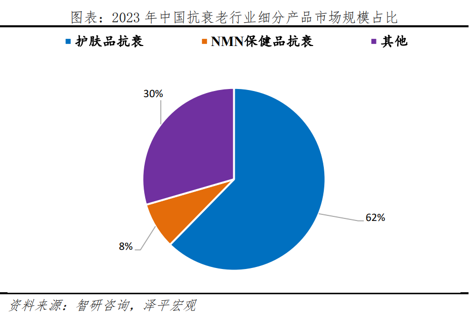 抗衰領(lǐng)域,隨著生活方式和化妝習(xí)慣變化,銀發(fā)族對永葆青春渴望推動抗衰老產(chǎn)品銷售增長,預(yù)計(jì)2024年中國抗衰市場規(guī)模達(dá)1500億元。2024年1月,國務(wù)院發(fā)布的《關(guān)于發(fā)展銀發(fā)經(jīng)濟(jì)增進(jìn)老年人福祉的意見》中強(qiáng)調(diào):“發(fā)展抗衰老產(chǎn)業(yè),推動生物技術(shù)與延緩老年病深度融合,開發(fā)老年病早期篩查產(chǎn)品和服務(wù)。”當(dāng)前,消費(fèi)者對抗衰老護(hù)膚品的需求日益多元化,市場消費(fèi)熱情持續(xù)高漲。根據(jù)智研咨詢數(shù)據(jù),2023年中國抗衰老行業(yè)市場規(guī)模約為1522億元,其中,護(hù)膚品抗衰老、NMN保健品抗衰、其他抗衰產(chǎn)品占比分別為62%、30%、8%。隨著抗衰老護(hù)膚品和保健品成分的迭代升級,越來越多消費(fèi)者認(rèn)可抗衰成分的有效性,并通過使用護(hù)膚品和保健品進(jìn)行抗衰老。根據(jù)艾媒咨詢數(shù)據(jù),目前,68.2%的消費(fèi)者通過健身進(jìn)行抗衰老,62.4%的消費(fèi)者使用護(hù)膚品,近五成的消費(fèi)者注重飲食和服用保健品。