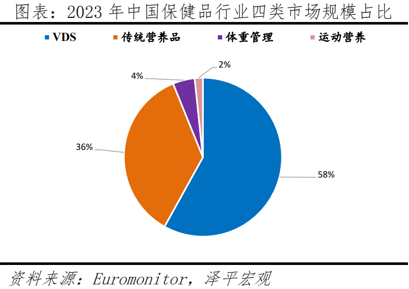 膳食補(bǔ)充劑占保健品市場主導(dǎo)地位,中老年人更偏好鈣片、奶粉、維生素和葉黃素等產(chǎn)品。保健品市場主要分為維生素和膳食補(bǔ)充劑(VDS)、運(yùn)動營養(yǎng)品、體重管理和傳統(tǒng)滋補(bǔ)四大類。根據(jù)Euromonitor數(shù)據(jù),2023 年VDS 市場規(guī)模占中國保健品行業(yè)近60%,消費(fèi)者主要出于日常增強(qiáng)免疫力的需求選擇VDS產(chǎn)品。其中,鈣片、奶粉、魚油、維生素、葉黃素等品類尤其受到中老年人的歡迎。例如,隨著年齡增長,老年人對營養(yǎng)的需求變化,專為老年人設(shè)計(jì)的高鈣奶粉、富含多種維生素和礦物質(zhì)的營養(yǎng)麥片、深海魚油等保健食品,有助于補(bǔ)充所需營養(yǎng),維持身體健康。對于患有慢性疾病或身體虛弱的老年人,膳食補(bǔ)充劑如維生素D、益生菌等,可以幫助他們更好地?cái)z取營養(yǎng),增強(qiáng)免疫力。從市占率看,根據(jù)Euromonitor數(shù)據(jù),2023年湯臣倍健在VDS市場的市占率為10.4%,穩(wěn)居行業(yè)龍頭,其次是安利與健合集團(tuán),前十企業(yè)市場集中度低于40%,我國保健品市場仍具有較大的整合和發(fā)展空間。(膳食補(bǔ)充劑是含有維生素、礦物質(zhì)、草藥或其它植物產(chǎn)品或氨基酸的產(chǎn)品(除煙草之外)。)