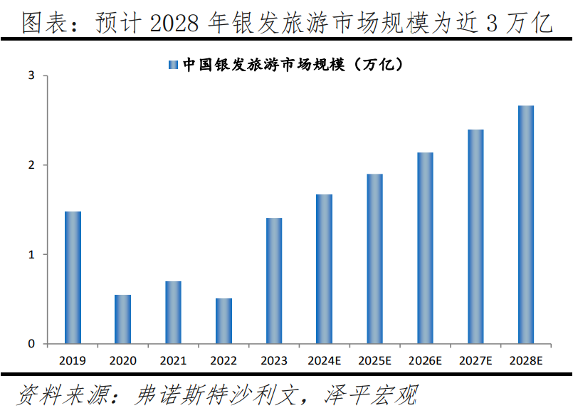 展望未來,隨著60、70后“黃金一代”逐漸步入老齡化,中高端旅游產(chǎn)品將迎來更多發(fā)展機(jī)遇,旅游服務(wù)重要性愈發(fā)凸顯,預(yù)計(jì)2028年,銀發(fā)旅游市場規(guī)模將達(dá)約2.7萬億元,2024-2028年年均復(fù)合增速將達(dá)12.4%。