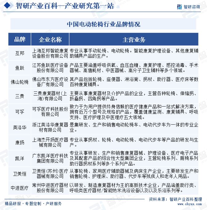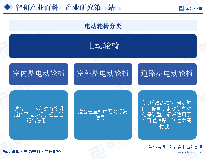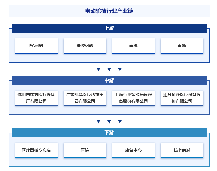 電動輪椅產(chǎn)業(yè)鏈上游為PC材料、橡膠材料、鋁合金、電機、電池、控制器、傳感器等。產(chǎn)業(yè)鏈中游為電動輪椅的生產(chǎn)制造商。產(chǎn)業(yè)鏈下游為醫(yī)療器械專賣店、醫(yī)院、康復(fù)中心、線上商城等。終端用戶包括老年人、殘疾人、傷病恢復(fù)者等需要輔助移動的群體。