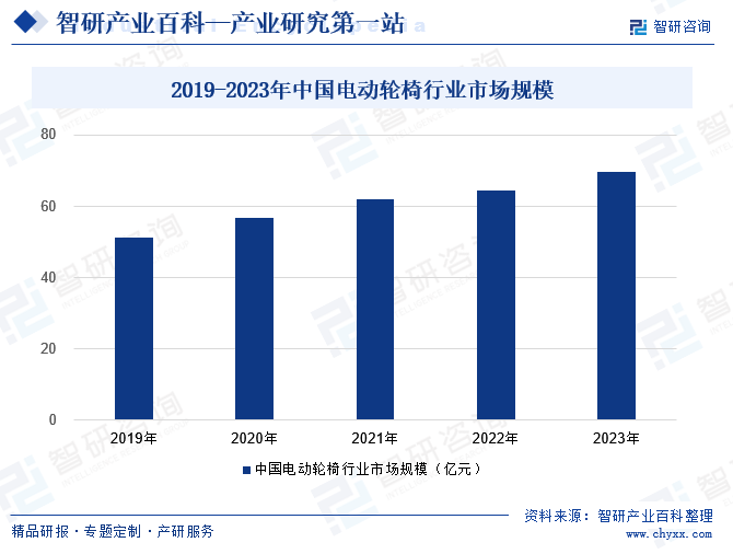 隨著全球人口老齡化的不斷加劇以及殘疾人口數(shù)量的穩(wěn)步增長,電動輪椅車的需求正呈現(xiàn)出顯著的增長趨勢。面對行動不便的困境,越來越多的老年人開始依賴電動輪椅作為他們?nèi)粘I钪械闹匾焦ぞ撸鴼埣踩巳后w更是迫切需要電動輪椅來滿足他們的出行需求。2023年中國電動輪椅行業(yè)市場規(guī)模為69.72億元,同比增長8.13%。隨著國內(nèi)老齡化問題的日益凸顯,預(yù)計對電動輪椅車的需求將持續(xù)增加,從而推動整個行業(yè)市場規(guī)模的進一步上漲。