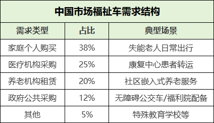 雖然普及度低,但實際上殘疾人和老年人對福祉車的需求相當(dāng)強烈。目前家庭個人購買福祉車的需求占比38%,其次是醫(yī)療機構(gòu)采購、養(yǎng)老機構(gòu)租賃等。