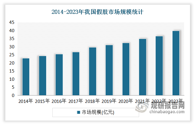 觀研天下數(shù)據(jù)表明,2023年中國假肢市場規(guī)模已接近40億元人民幣,其預測2024-2031年中國假肢市場的年均復合增長率(CAGR)約為15.8%。