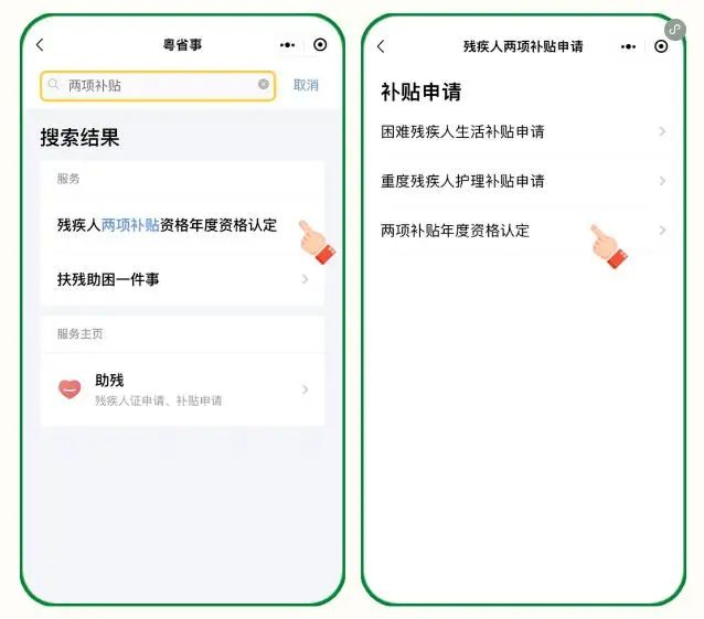 進入“粵省事”APP或微信小程序,首頁搜索“兩項補貼”,點擊【殘疾人兩項補貼資格年度資格認定】,按提示操作進行資格認定。
