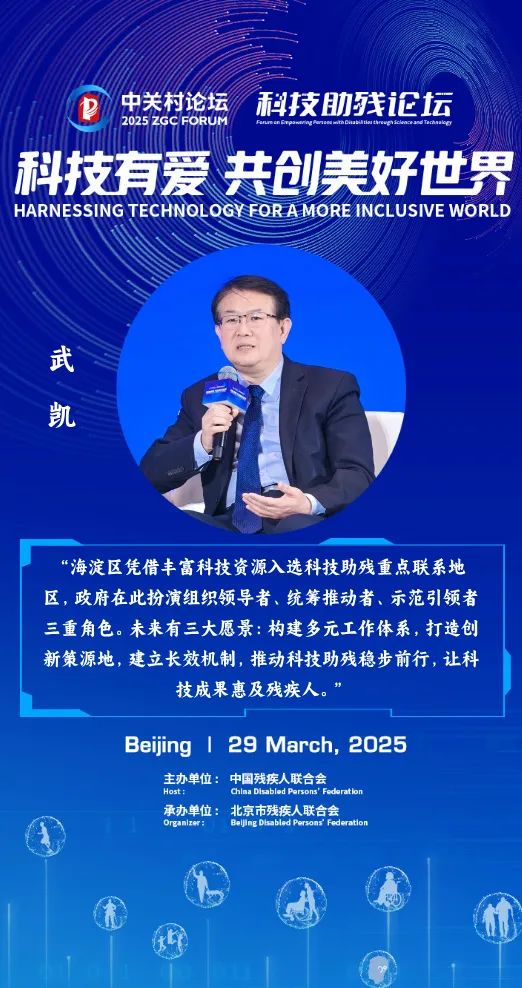 3月29日,由中國(guó)殘聯(lián)主辦、北京市殘聯(lián)承辦的2025中關(guān)村論壇年會(huì)科技助殘平行論壇在北京舉行。中國(guó)殘聯(lián)主席程凱出席論壇,中國(guó)殘聯(lián)黨組書(shū)記、理事長(zhǎng)周長(zhǎng)奎,北京市副市長(zhǎng)馬駿,科技部五司司長(zhǎng)鄭健出席論壇開(kāi)幕式并致辭。