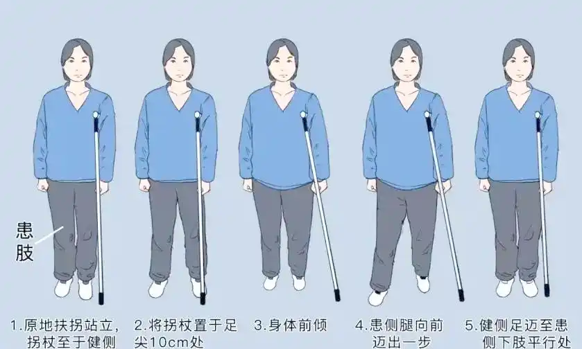 單拐步行技巧:將拐杖置于健側(cè),步行時應遵循以下順序:先伸出拐杖,緊接著邁出患側(cè)腿,最后健側(cè)腿跟上,以保持平衡。雙拐步行技巧:在步行時,首先將雙拐與患肢同時伸出,然后緊跟健側(cè)腿的邁出,以維持身體的平衡。請注意,患肢在此過程中需承擔部分體重。