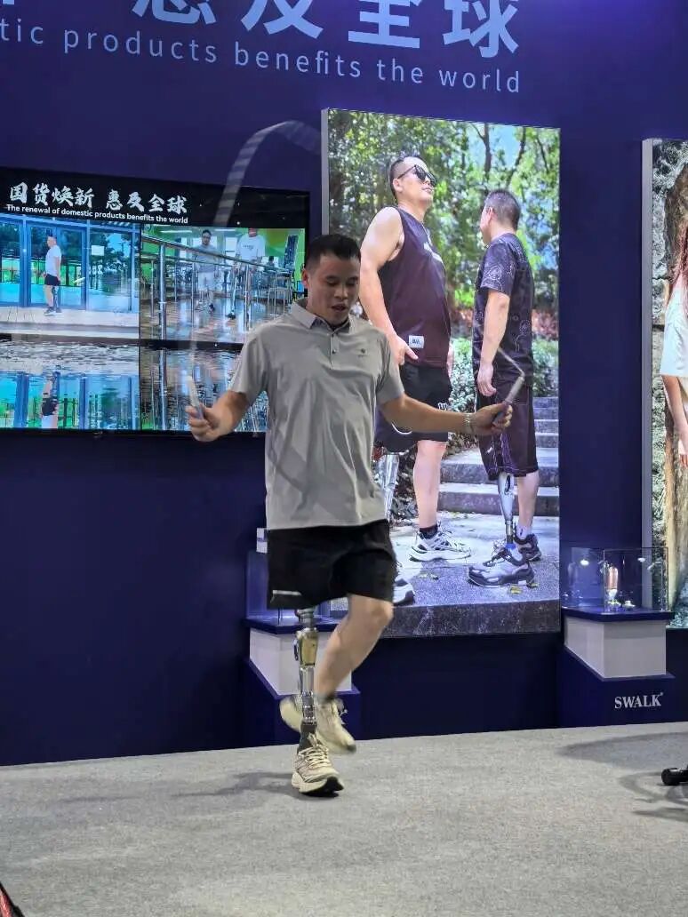 工作人員演示穿戴智能假肢跳繩