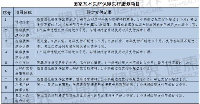 2010年9月,國家衛(wèi)計委宣布將9項醫(yī)療康復(fù)項目納入基本醫(yī)療保障范圍。2016年4月,人社部、國家衛(wèi)計委、民政部、財政部、中國殘聯(lián)共同宣布,新增20項醫(yī)療康復(fù)項目納入基本醫(yī)療保障支付范圍。